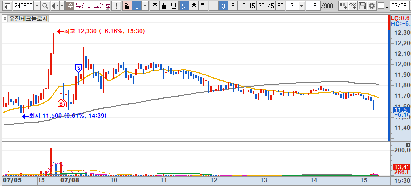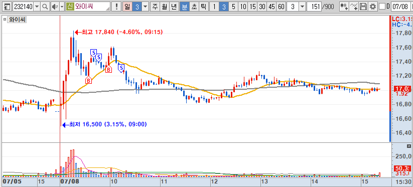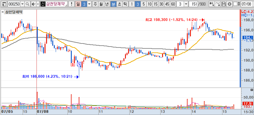 자회사 유산균 약 중국 진출 뉴스가 있었긴 했는데, 그 보다 당일 수급과 3분봉 차트가 너무 좋아보여 슈팅 한 번 줄 것 같아 오후까지 꾸역꾸역 들고 갔다가 오늘은 안가려나보다 하고 매도. 역시나 내가 나가면 올라. 거래량 싣은 매수세에 버티는 모습을 보고 매매에 참여. 중익절치고 종가 베팅했다가 시간외 갭 떠서 전량 매도.