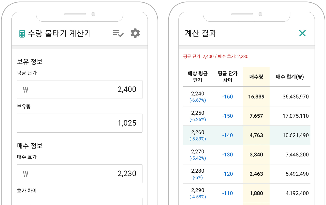 보유하고 있는 주식의 평균 단가와 수량을 기준으로 현재 매수하려고 하는 호가에 대한 매수 수량과 예상 평균 단가를 정확하게 계산해줍니다.