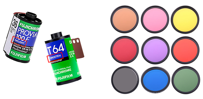 필름 카메라 시절에는 색 온도를 맞추기 위해 주광용(DAYLIGHT) 필름과 텅스텐용(TUNGSTEN) 필름을 구분하여 사용했으며 색상필터를 통해 색 온도를 임의로 조절하기도 하였습니다. 예를 들어 노란 빛의 텅스텐(TUNGSTEN) 조명 아래에서 텅스텐용(TUNGSTEN) 필름을 사용하지 않고 주광용(DAYLIGHT) 필름을 사용하였다면 실제 색 온도보다 노란 결과물을 얻을 것입니다. 이럴 때에는 노랑색과 반대되는 색인 파랑색 필터를 사용하여 색 온도를 조절해준다면 비교적 본래의 색 온도를 찾을 수 있습니다.